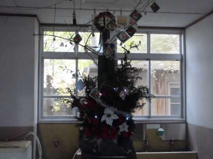 先日地域の方が職員室の横の手洗い場の前の樽の上を12月の飾りつけに変えていただきました。