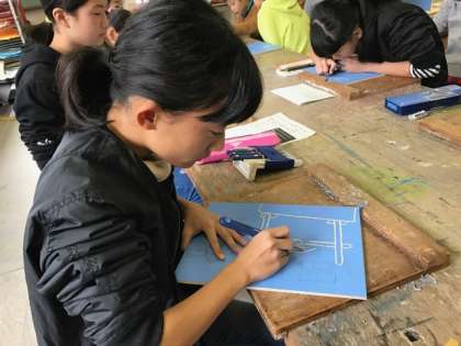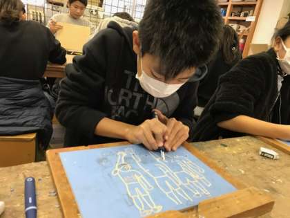 いよいよ彫りはじめました。彫刻等の正しい使い方を確認して、線彫り・面彫りしています。