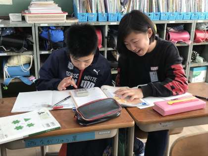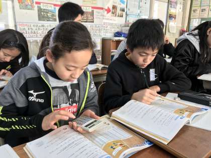 たくさんの記録の平均を,電卓を使って調べました。1つでも間違えるとやり直しになるので,集中して学んでいます。2人組で協力するペアも見られました。