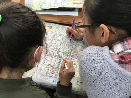 路線図を見ながら,どのバスに乗るとうまく行けるかを考えています。