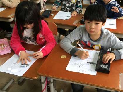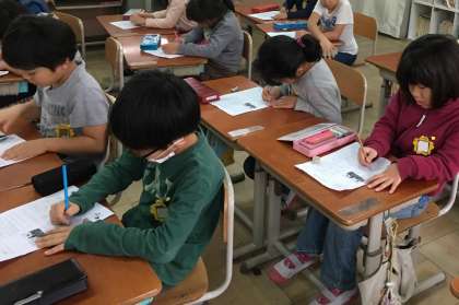 お話を聞きながら,自分が考えたことをプリントに記入します。