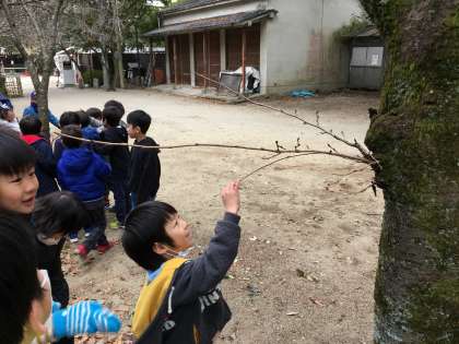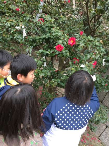 アジサイが枯れていたり,椿が咲いていたり,イチョウ畑が無くなっていたり,おみくじが結んであったり,木の枝から新芽が出ていたり…。たくさんの冬を見つけました。
