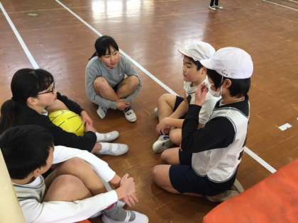「ボールをつなぐ」おもしろさを感じています。どうしたらつなぐことが話し合いました!