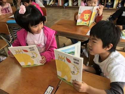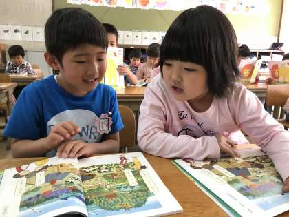 教科書の絵を見ながら,質問したり答えたりしています。「なにがいますか?」「きつつきがいます。」「どこにいますか?」「木にいます。」「なにをしていますか?」「おうちを作っています。」ひとりひとりがよく考えています。会話が弾んでまだまだしたい様子でした。