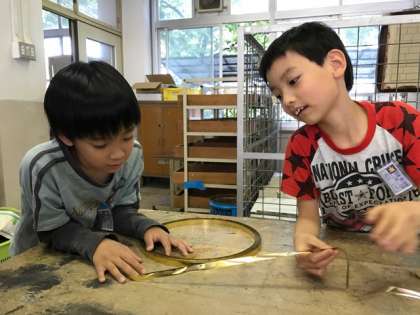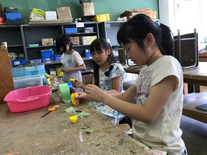材料や場所とかかわる子供たち。その表情がなんとも素敵です。図工をしているときの子供は,輝いています。