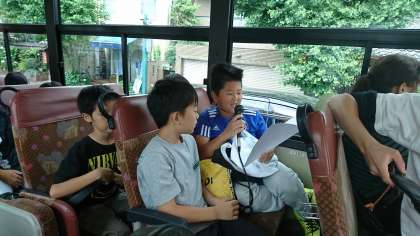バスの中では早速レク係が大活躍中!