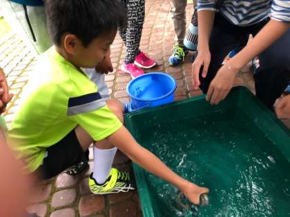 残念ながら,天候の影響で水槽での魚つかみになってしまいました。しかし・・・,なかなかつかまらないものです・・・。