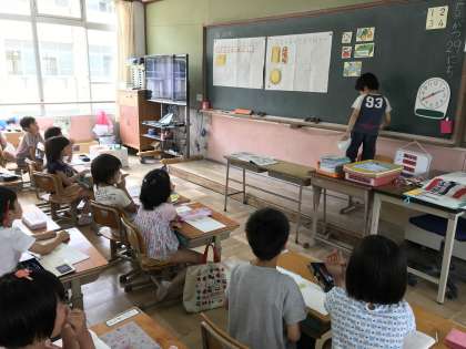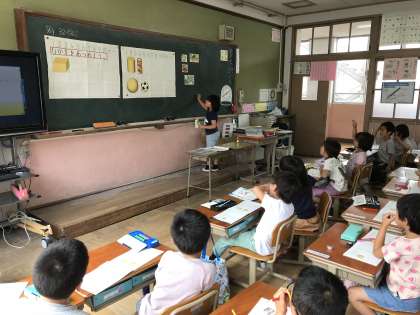 はこ型,つつ型,ボール型の特徴を考えています。「はこの形はたいらなところがあるよ。」「たいらなところがあるから,つみあげることができるよ。」みんな一生懸命考えています。