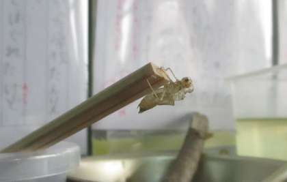 学校のプールで捕まえてきたヤゴたちが,教室でどんどんトンボになって飛び立っています。