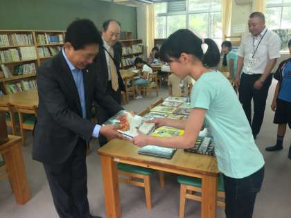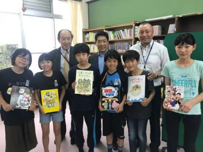 書籍寄贈式には図書委員の子どもたちが参加し,
