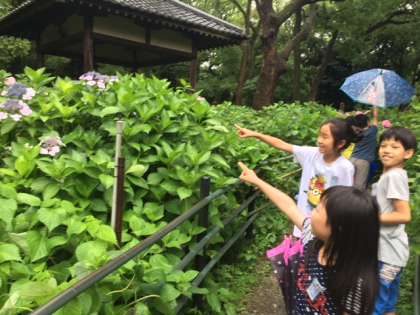 みんな思い思いにお気に入りのあじさいを探していました。