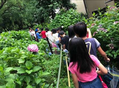 傘を差しながらものんびりあじさい観察(カタツムリ探し?)