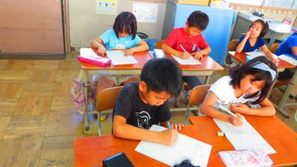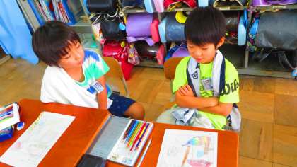 図画工作の学習「見て見て お話」の下絵を描いています。「どんな人物かな」「どんな動物かな」「どんな場所かな」…といっぱい考えて描きました。