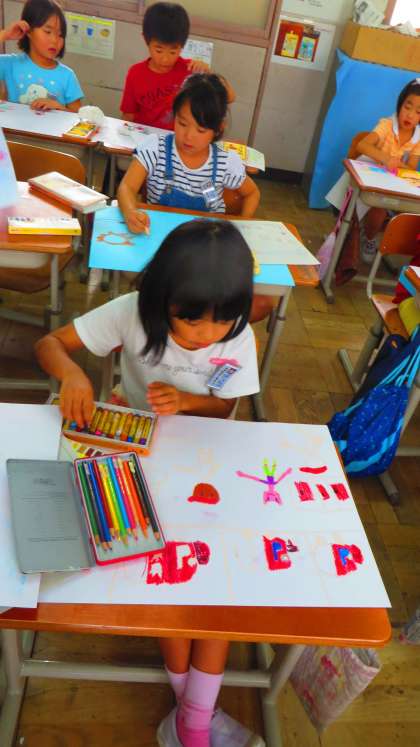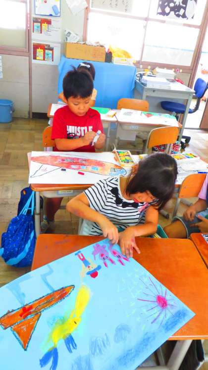 図画工作の「見て見てお話」です。前回描いた下絵を,大きな画用紙に描きました。「大きいなぁ〜。」「何を使って描こう…。」「クレパスがいいかな。コンテがいいかなぁ。」などなど,いろいろ考えながら描き進めました。出来上がるのが楽しみです!