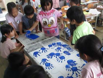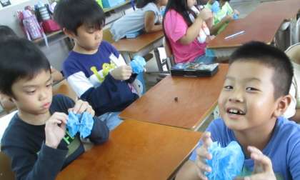 青組勝利の願いと決意を込めて,手形をぺったん!紙のお花も丁寧に作りました。