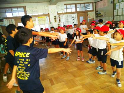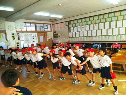 5・6年生の応援団の人たちが応援を教えに来てくれました。1年生の子どもたちも,ノリノリでがんばっています!