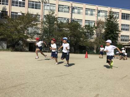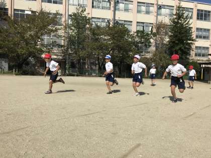 今日は50m走の練習をしました。「ようい,ドン!」の合図で一斉に飛び出していきます。ゴールまで全力で走りきります!