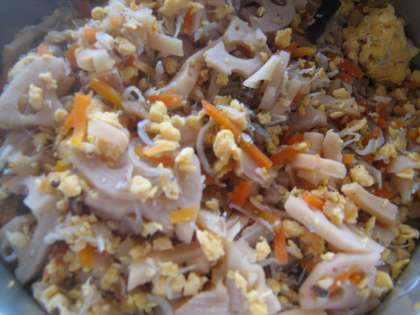 「ちらしずし」には,「かんぴょう・しいたけ・にんじん・たけのこ・れんこん・しらすぼし・いり卵」が入っていました。ご飯に混ぜて,きざみのりをかけて食べました。