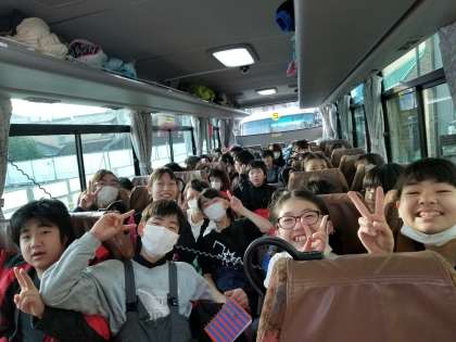 心配していた天候もばっちり!いよいよ卒業課外学習に出発します!バスの中も笑顔がはじけます!