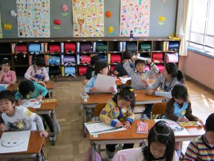 【2枚目の写真】図工の時間の様子です。みんな一生懸命に画用紙に向かい,自分の顔をかきあげてくれました。