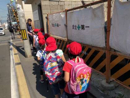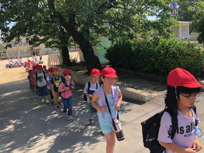 とってもいいお天気の中,待ちに待った初めての遠足,出発です!車通りの多いところは1列に並んで歩きます。