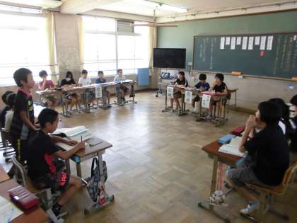 6年生では,学級討論会をしています。ある議題に対して,肯定と否定に分かれて討論します。また,司会グループが進行をしたり,聞くグループは討論を聞いたうえで結論を出したりするなど様々な役割がある中で討論を進めています。