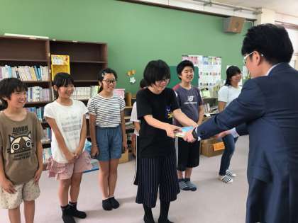 図書委員会の6年生が学校の代表として本を受け取りました。