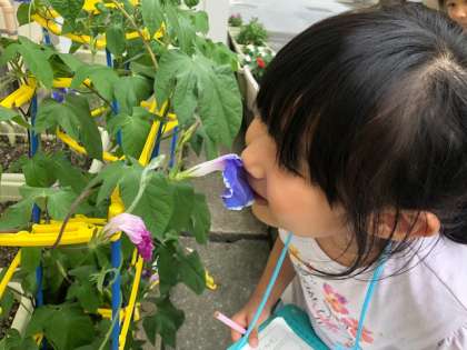 運ぶのが大変!そんな時は,友だちと一緒に運びます。においをかいで観察カードにかく子もいました。