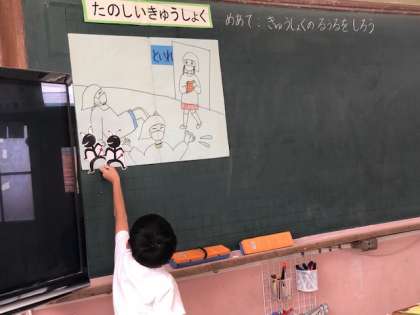 栄養教諭の野秋先生と,給食時間のルールについて学習します。たくさんの人が積極的に手を挙げて発表していました。これからの給食時間に活かそうね!