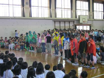 5年生は,1年生を守る「高学年戦隊5ネンジャー」の出し物やきれいな歌声で歌えるように頑張ってきた「心から心へ」という歌をプレゼントしました。