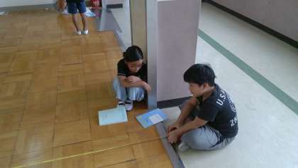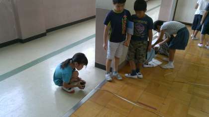 算数『時間と長さ』では,まきじゃくを使っていろいろな長さを測りました。教室の縦と横の長さを測っています。