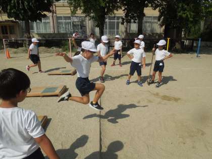 初めてのはばとび。助走・踏み切り・着地に気をつけて,学習をしました。