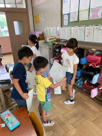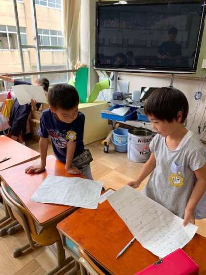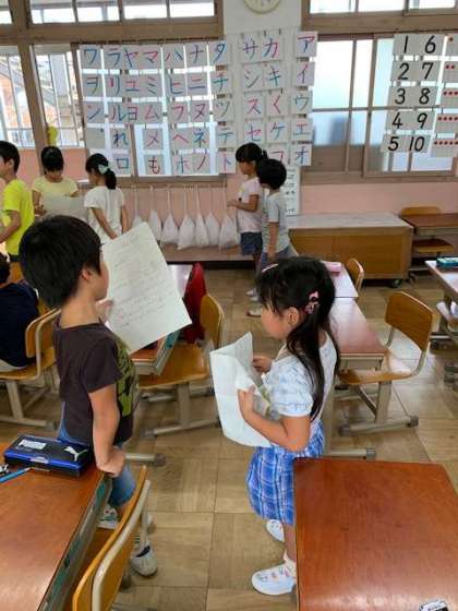 1年生の「ゆうやけ」という国語の単元で,お話の中から,好きなところを選んでその理由の紹介をしました。新しい服をほめられたことや,靴を買ってもらったけど大きかったことなど,楽しいエピソードをたくさん聞くことができました。