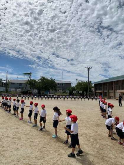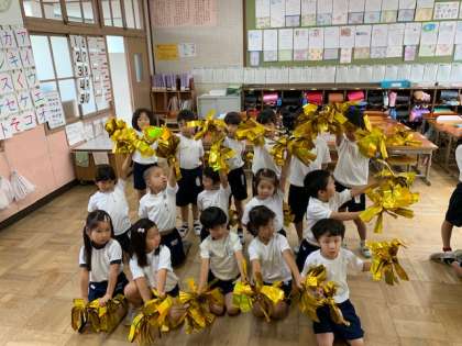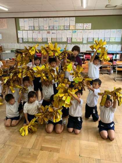 運動会のダンスの練習も終盤に差し掛かってきています。今は最後の見せ場のポンポンで字を作る,ポン字の練習をしています。これがなかなか難しく,みんなで息を合わせなければ字になりません。写真は何の字かわかりますか?本番では素敵な字になるように頑張りたいと思います。