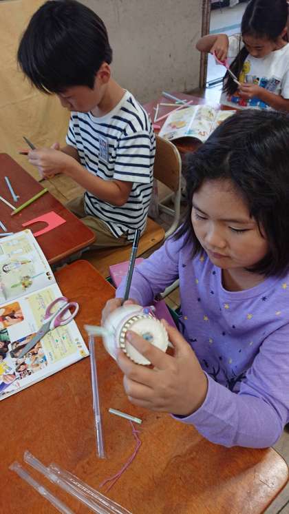 ストローの切込みやテープを貼る位置などによって,ストローの動き方を工夫しています。どんな作品ができあがるかな?