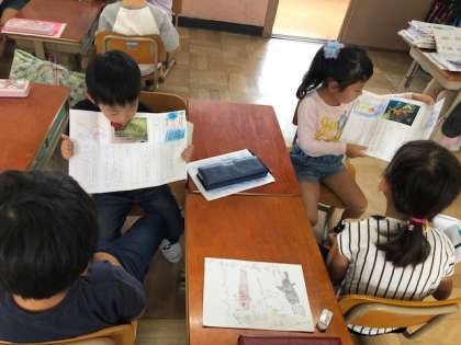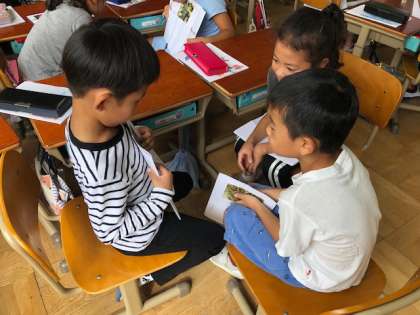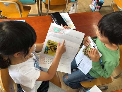 かくれんぼしている生き物を本から選んで,一人ひとりオリジナルのかくれんぼカードを作りました。教科書の文章を真似して,うまく生き物を紹介している子もいました。4月から,国語ではたくさん友だちと話す機会がありましたが,どんどん上手に話すことができるようになっています!