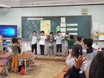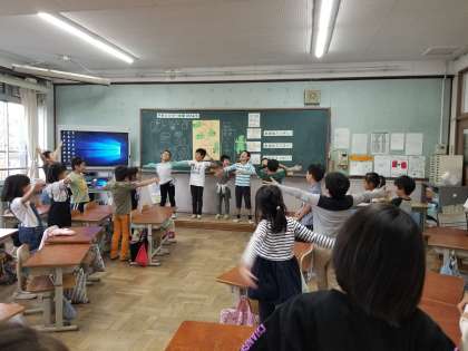 野菜パワーの「おめめパッチリ!」「おはだすべすべ!」「おなかスッキリ!」を,皆で考えた動きで,子ども先生が皆の前でやってくれました。