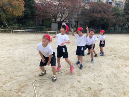 先頭の友だちのまねっこをしながら遊びます。いろいろな場所で,いろいろな動きをしていました。寒さに負けず,子どもたちはとっても笑顔で楽しそう!