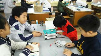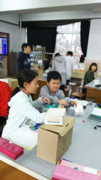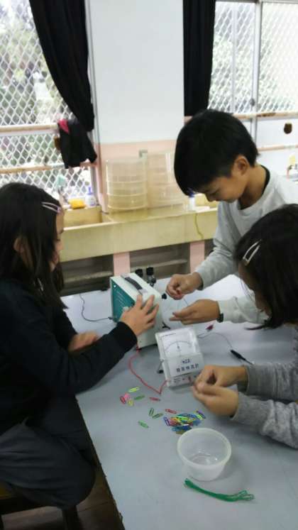 実験中の様子です。電磁石の性質について考えています。実験した結果から分かったこと,考えたことを話し合っています。クリップがいっぱいくっついてくる様子は見ていてとても楽しいです★