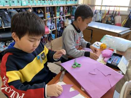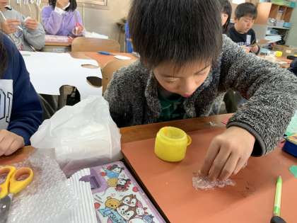 こんな生き物や世界があればいいのか考え,アイデアスケッチを見ながら,材料を選んで工夫しながら版を作りました。