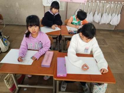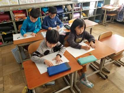 図画工作の時間に紙版画を作っています。テーマは国語で学習したスイミーにちなんで,海の生き物です。魚,たこ,亀…色々な海の生き物を楽しんで作っていました。