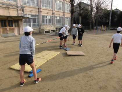 体育の学習では,走り高跳びをしています。自分の目標記録を設定し,友だちと教え合いながら挑戦しています。「やった!105センチ跳べた!」「どうしたらいいかな?」「踏み切り板の位置を変えたらどう?」などお互いに相談しながら頑張ってやっています。