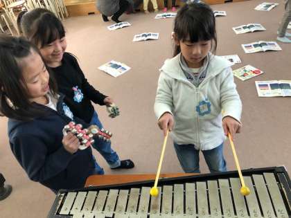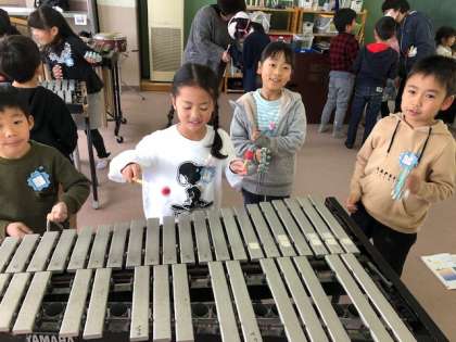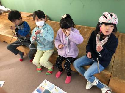 きらきら星を鍵盤ハーモニカで吹くことができるようになり,いろいろな楽器を使ってほしぞらの音楽をつくります。グループごとに音の出し方を工夫して,楽しく学習していました。