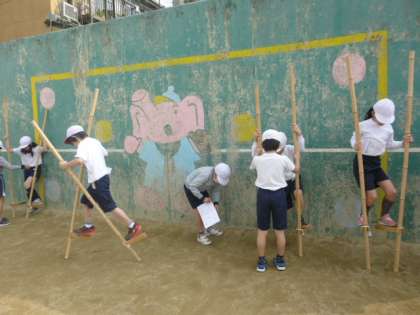 竹馬・一輪車・輪・棒を使ってそれぞれの用具に合わせた動きを考えます。