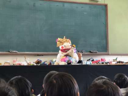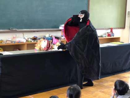 なまけもののなま子ちゃんの人形劇に,みんなくぎ付けです。ばいきんまんもやってきました。