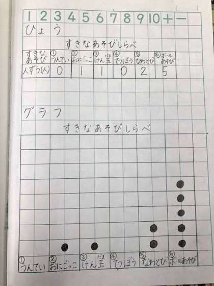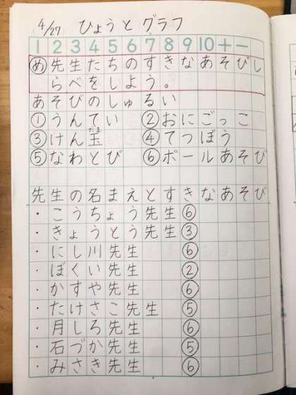 どのあそびが一ばん人気なのか,わかるかな?学校がはじまったら,クラスのみんなで「すきなあそびしらべ」をしましょうね!
