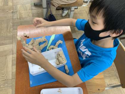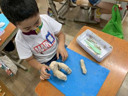 一年生の時のひもひもねん土とは違い,手や指でねん土を握って,何に見えるかな?と想像しながら楽しんでいました。