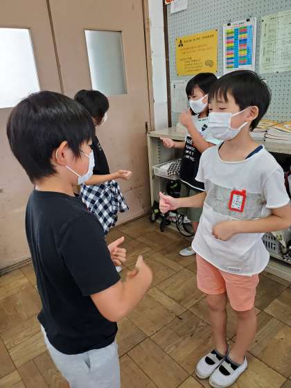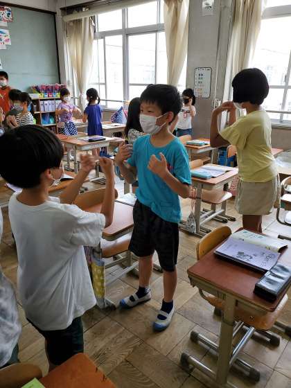 今日は外国語活動でお互いに挨拶をする活動をしました。ジェスチャーもつけながら挨拶し,「How are you?」とお互いの様子を尋ねました。給食前の5時間目だったので,どうやら「Hungry」が多そうでした(*^▽^*)5時間目が終わった後に,皆でお腹いっぱい給食を食べました♪