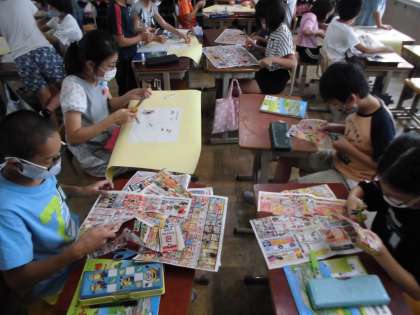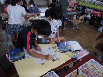 広告にあるものを切り取って産地を調べ,日本地図に書き込んでいきます。「すごい!全国各地いろんなところから来ているんだ!」「外国産も意外と多いなあ〜」など新しい発見がたくさんあったようです。