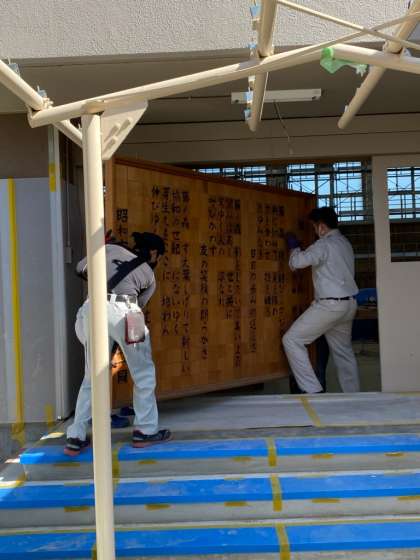 伝統の「校歌」の掲示はそのまま新生体育館でも使用します。保管してあった校歌掲示が体育館に運び入れられました。皆さん,「ドナドナ」という歌をご存じでしょうか?運び入れるのを少し手伝って写真を撮っていると,なぜかあの曲が脳裏をよぎりました…。そんな感じになるのって私だけ…?